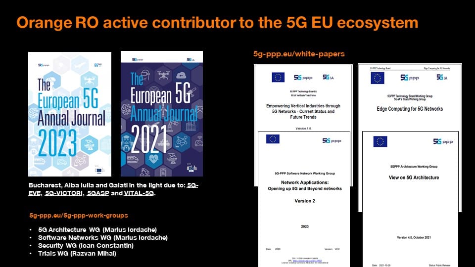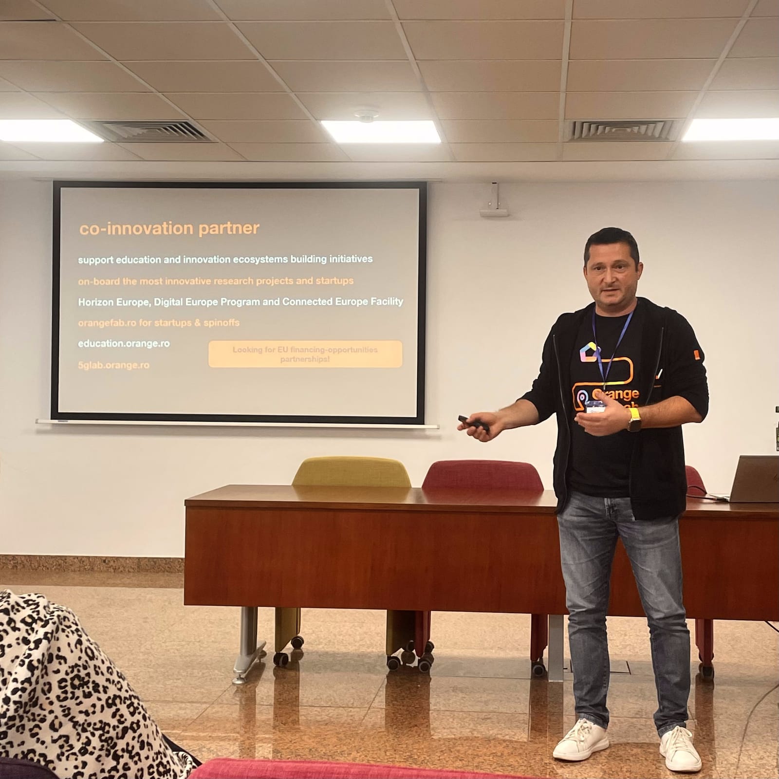 În prima zi a conferinței, în cadrul secțiunii dedicate partenerilor conferinței, colegii noștri: Cristian Patachia-Sultanoiu, Development & Innovation Manager și Răzvan Mihai, IoT Architecture & Services Expert, au susținut timp de 20 de minute o prezentare cu titlul: Innovation @ Orange. Tech Transfer from Innovations & Research to Business în care au fost arătate diferite aplicații realizate în cadrul proiectelor europene din care Orange este parte. A fost prezentat și cel mai nou proiect european în care Orange Romania este implicată: Connected Europe Facility - 5G for Smart Communities.